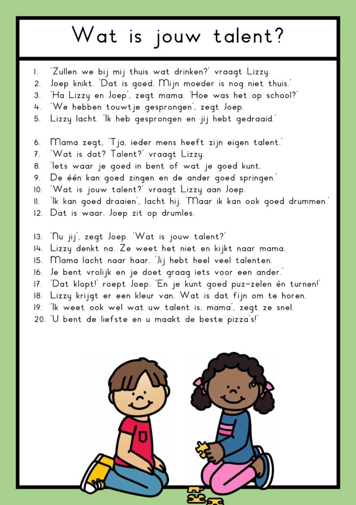 Hieronder vind je een aantal gespreksvragen die je kunt gebruiken bij de teksten uit deze bundel. Deze vragen helpen kinderen om na te denken over de inhoud van de tekst en het thema, maar ook om hun eigen gevoelens en ervaringen te delen. Door in gesprek te gaan over de verhalen ontwikkelen ze niet alleen hun taalvaardigheid, maar ook hun sociaal-emotionele vaardigheden. Je kunt de vragen klassikaal bespreken, in kleine groepjes laten beantwoorden of in tweetallen laten uitwisselen. Zo maak je van het lezen een betekenisvolle en interactieve ervaring!
