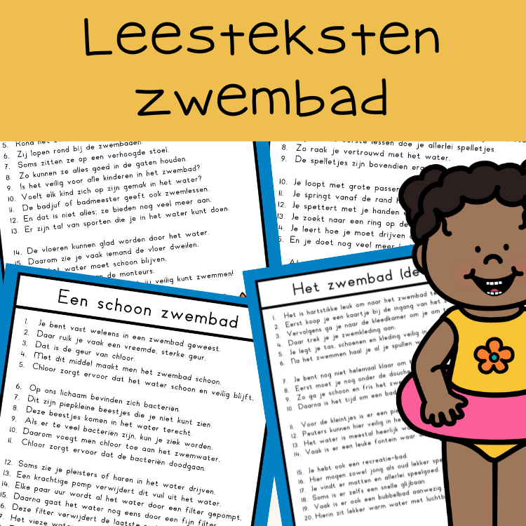 In deze bundel vind je 9 teksten rondom het thema zwembad. De teksten zijn in kleur en zwart/wit beschikbaar. Ze zijn zoveel mogelijk geschreven op groep 4 leesniveau. Er zijn ook teksten voor groep 3 over dit thema.