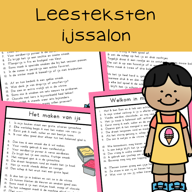 In deze bundel vind je 10 teksten rondom de ijssalon. De teksten zijn in kleur en zwart-wit beschikbaar. Ze zijn zoveel mogelijk geschreven op groep 4 leesniveau.