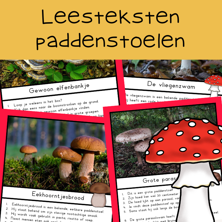 In deze bundel vind je 10 teksten over paddenstoelen. De teksten zijn in kleur beschikbaar. Ze zijn zoveel mogelijk geschreven op groep 4 leesniveau.
