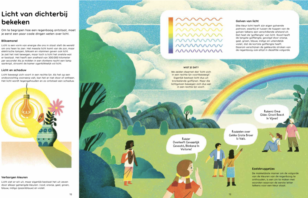 Dit boek is bijzonder omdat het op een leuke manier wetenschap en fantasie samenbrengt. Het begint met een vraag die veel kinderen zichzelf wel eens stellen: “Hoe ontstaan regenbogen?” Vanaf dat moment ga je mee op een avontuur dat niet alleen uitlegt hoe regenbogen ontstaan, maar ook hoe licht werkt en waarom we kleuren zien.