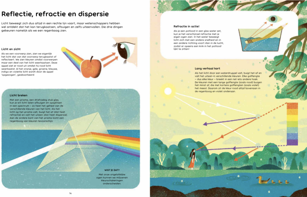 Wat dit boek zo fijn maakt, is dat het lastige dingen zoals lichtbreking en het kleurenspectrum simpel uitlegt. De taal is makkelijk te begrijpen en de voorbeelden zijn duidelijk, zodat kinderen het goed kunnen volgen zonder dat het te moeilijk wordt.