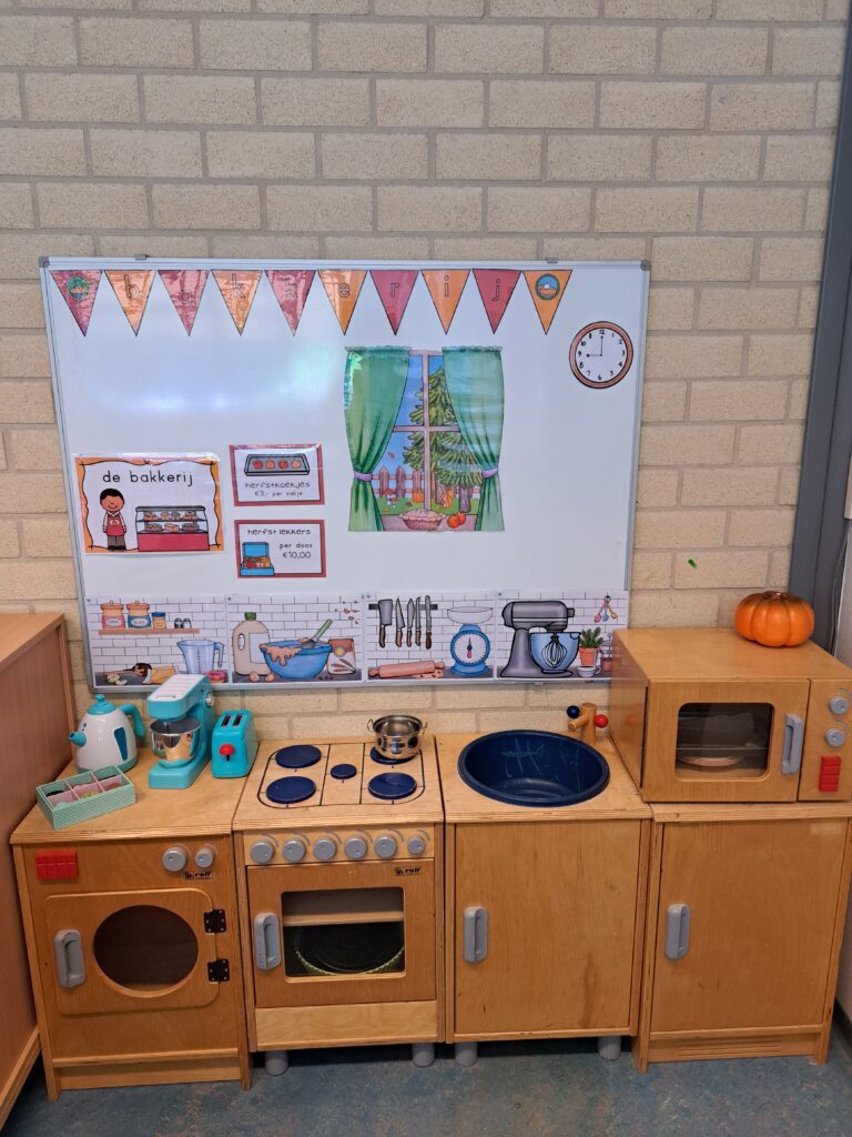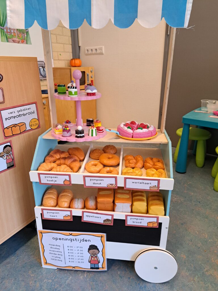 - Door de bakkerijhoek te combineren met de huishoek, kan er een echt winkelspel ontstaan waarbij kinderen van rol wisselen en van alles met elkaar overleggen.