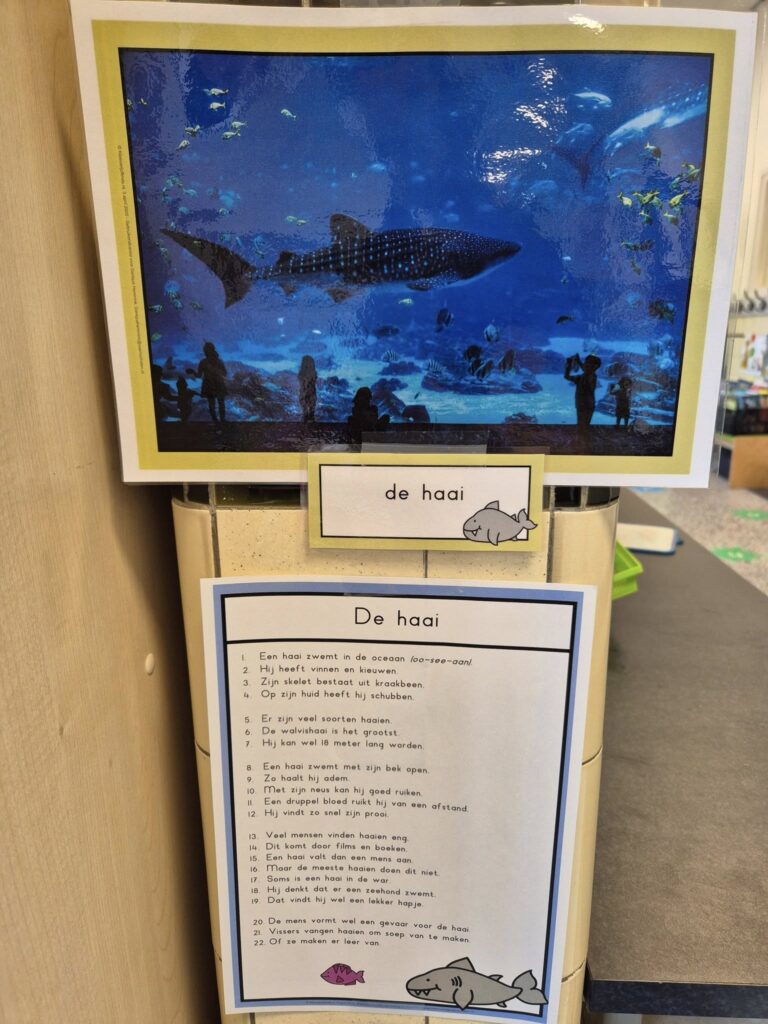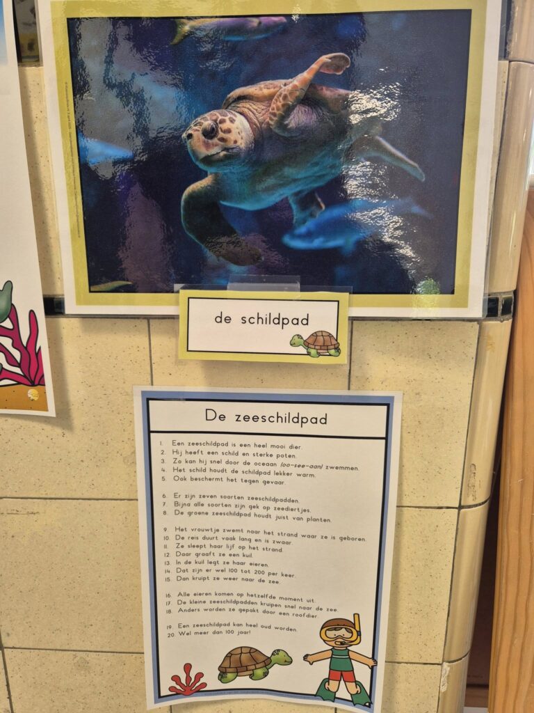 In de zeehoek wordt dit gedaan door foto’s van zeedieren te combineren met teksten en visuele labels zoals ‘het aquarium’ en ‘pas op nat’. Dit trekt de aandacht en maakt het lezen laagdrempelig. Daarnaast kunnen kinderen een verhaal schrijven over een dag in het leven van een zeepaardje of een haai. Hoe ziet hun dag eruit? Wat eten ze? Waar zwemmen ze heen?