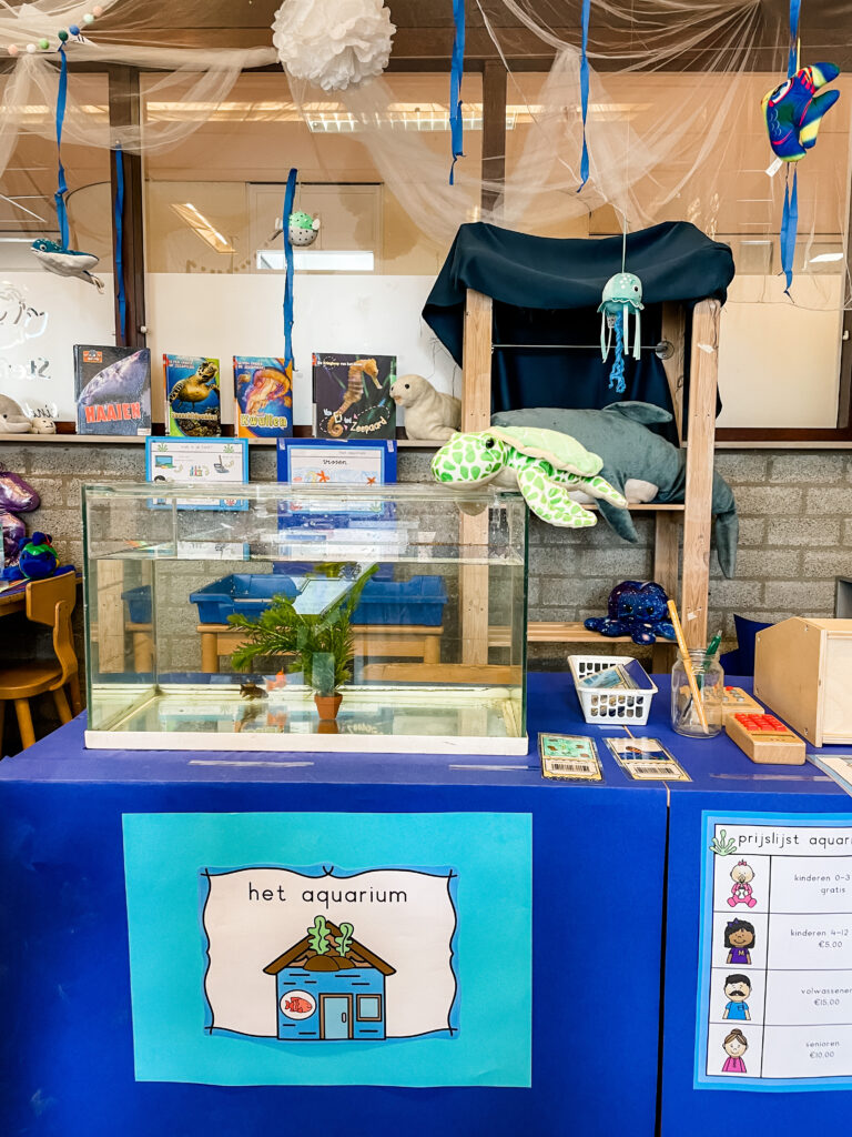 Lezen wordt pas echt leuk als een tekst ergens toe leidt. Maak het functioneel door teksten aan te bieden die kinderen verder helpen in hun spel. Een mooi voorbeeld hiervan zie je in de zeehoek rondom het aquarium. Hier zijn leesteksten geplaatst over verschillende zeedieren zoals de kwal, de haai en de schildpad. Ze leren over de kwal die zijn prooi verlamt met zijn tentakels, over de haai die zelfs een druppel bloed van grote afstand kan ruiken en over de zeeschildpad die haar eieren op het strand legt en daarna weer de zee in kruipt.