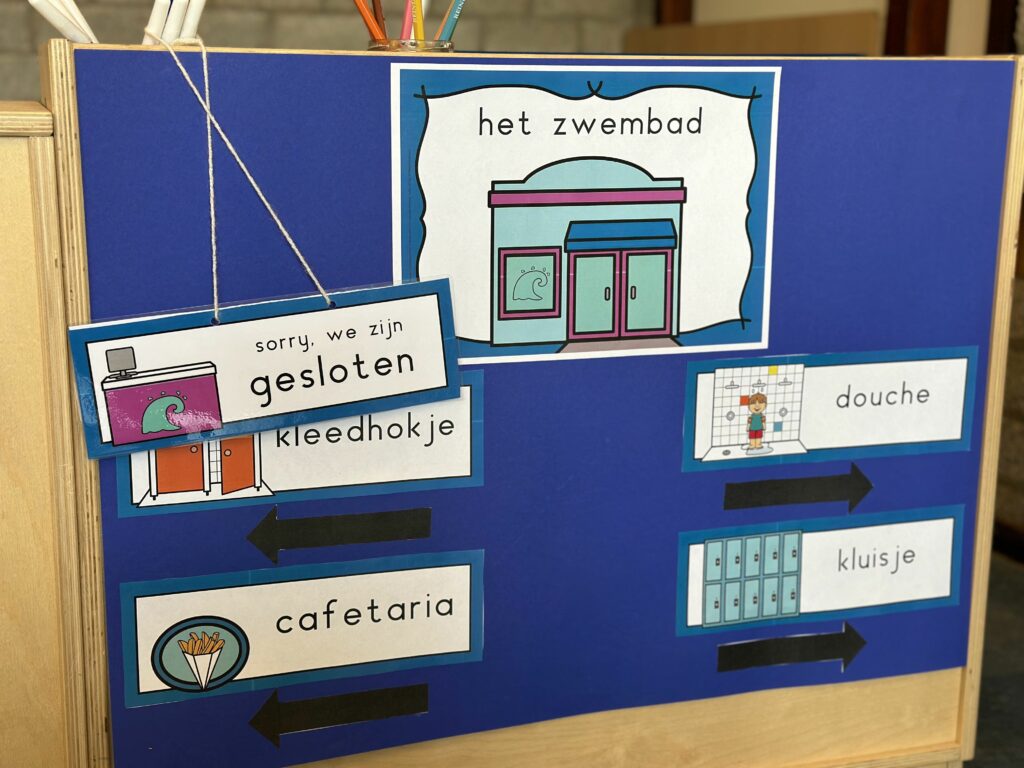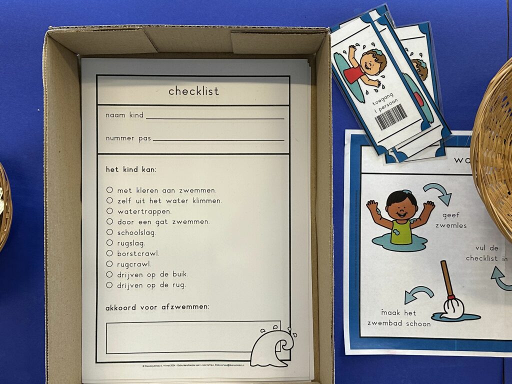 Gebruik het themahoekpakket over het zwembad om de hoek in te richten. In dit pakket vind je posters, naambordjes, prijslijsten en andere materialen die je kunt gebruiken om de hoek aantrekkelijk en informatief te maken.