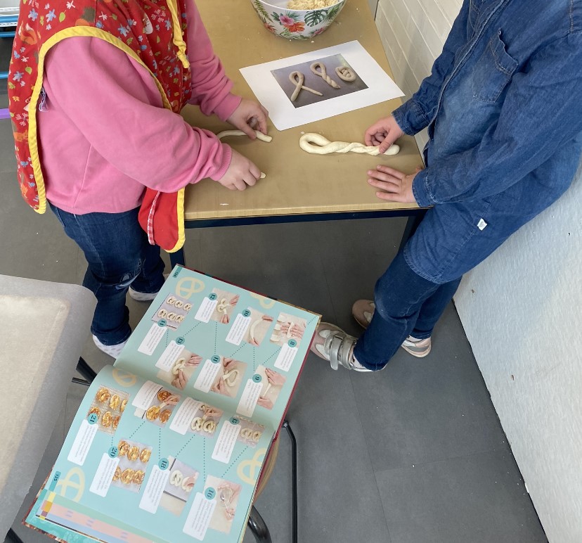 - Materiaal maken: Menukaarten schrijven, etiketten maken, prijslijst ophangen. Kinderen schreven zelf labels voor de producten, zoals ‘brood’, ‘croissantje’ en ‘taartje’ en hingen deze aan de rekken.