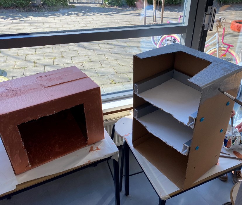 - Dag 3: Kartonnen oven en rek verven. Hier zie je hoe kinderen samen aan de slag gaan met het verven van de oven en het broodrek. Ze kiezen zelf de kleuren en bepalen waar de knoppen komen.