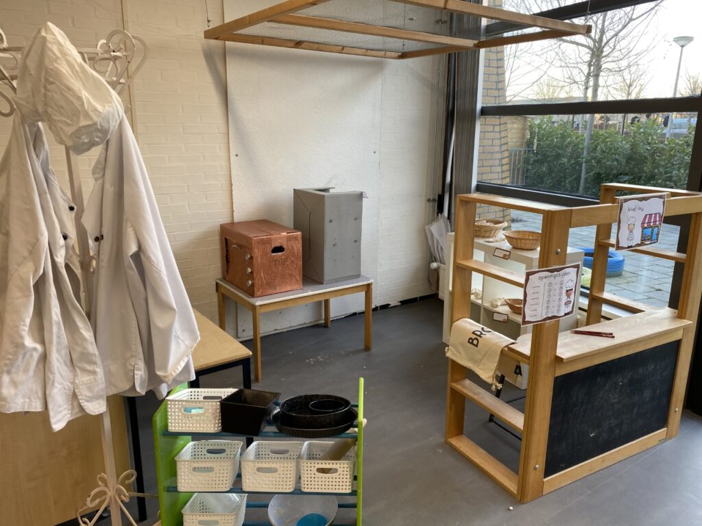 - Hoek inrichten: Waar komt de kassa? Waar staat de oven? In de bakkerijhoek is een oud tafeltje gebruikt als toonbank en een kartonnen doos werd omgebouwd tot oven.