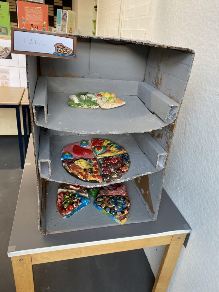 - Dag 2: Materiaal verzamelen – dozen, verpakkingen, spelkaarten. De kinderen verzamelden lege doosjes voor brood en taart, die later geschilderd en gelabeld werden.